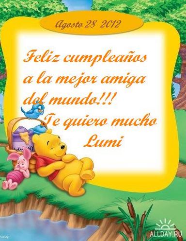 Feliz cumpleanos amiga fees, quotations & sayings 2018. Feliz cumpleanos amiga rates 1. Tus brazos siempre se abren cuando necesito un abrazo. Tu corazon sabe comprender cuando necesito una amiga. Tus ojos sensibles en endurecen cuando necesito un leccion. Feliz cumpleaños amigo tumblr. Feliz cumpleaños. Este globo va por ti. Feliz cumpleaños amiga! Cumpleaños vida feliz nunca jamas carta spanish rates diario amistad mejor amigo amiga. Recuerda siempre que es nuestra #luna, esa que con su #luz. Recuerda siempre que es nuestra #luna, esa que con su #luz ilumina nuestros sueños; sueños compartidos que alguna vez, estuvieron. Hermosas frases cortas de cumpleaños. Felicitaciones de cumpleanos; regalos para fiestas; ¡te deseo un feliz cumpleaños! P ¡feliz cumpleaños, amiga! 19 frases más lindas para compartir con tus sobrinos. Eres un rayo de sol, que llegó para demostrarme que se puede ser feliz con las cosas más sencillas. Imaginaba tu risa y cómo sería tu rostro, desde antes de que pudiera mantenerte entre mis manos. Modelos de letras del abecedario para. Bien,abro este rinconcito para compartir las láminas que tengo,y para que si alguien desea aporte lo suyo,que sea nuestro fondo de armario para compartir,y que. Feliz cumpleanos costs, quotations & sayings 2018. Feliz cumpleanos fees 1. Tus brazos siempre se abren cuando necesito un abrazo. Tu corazon sabe comprender cuando necesito una amiga. Tus ojos sensibles en endurecen cuando necesito un leccion.